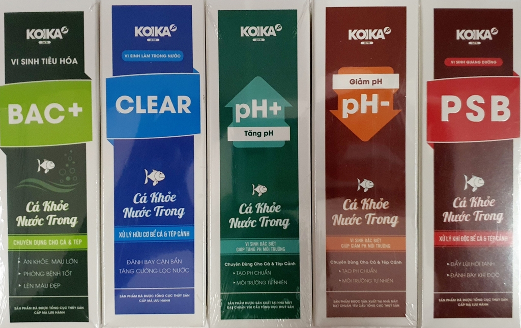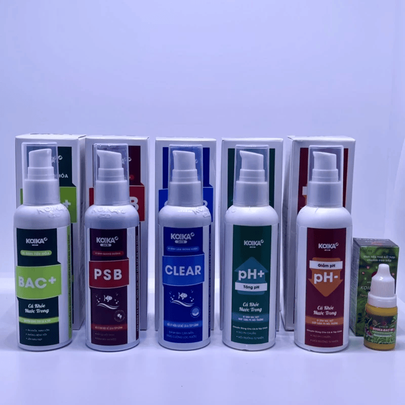 Bộ sản phẩm vi sinh Koika gồm 5 loại: BAC+, PSB, Clear, pH+ và pH-, được thiết kế nhằm cải thiện chất lượng nước và sức khỏe cho cá và tép cảnh.
