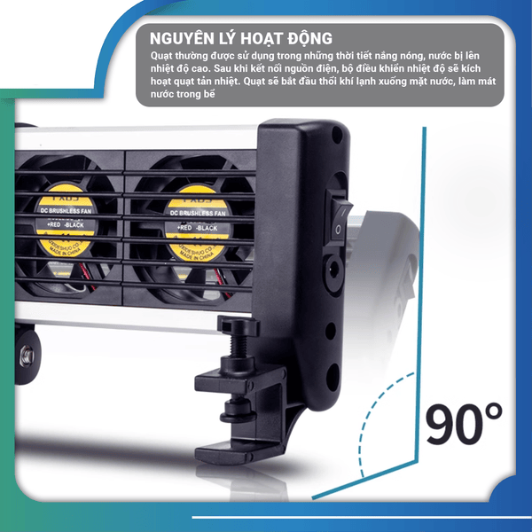 - Thiết kế khớp chỉnh 90 độ để dễ dàng điều chỉnh làn gió của quạt khắp bể