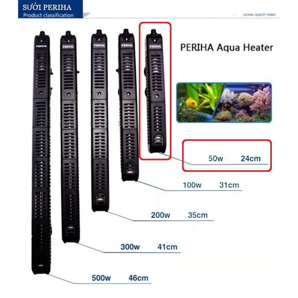 Sưởi Hồ Cá HEATER PERIHA, giúp giữ nhiệt độ trong hồ cá một cách ổn định, có thể điều chỉnh nhiệt độ theo mong muốn theo nút chỉnh bên trên cây sưởi. Được bao bọc bởi lớp nhựa để bảo vệ cá tiếp xúc trực tiếp với thân sưởi. An toàn khi sử dụng.
